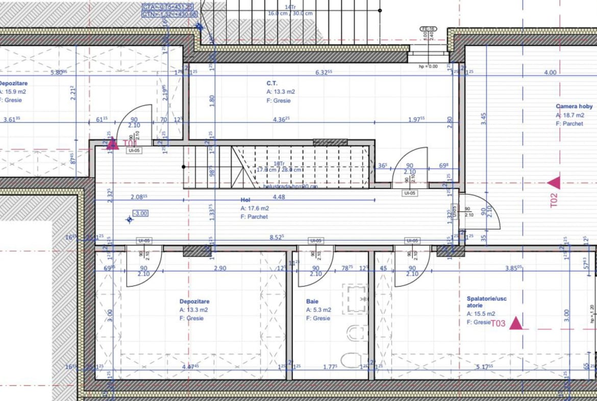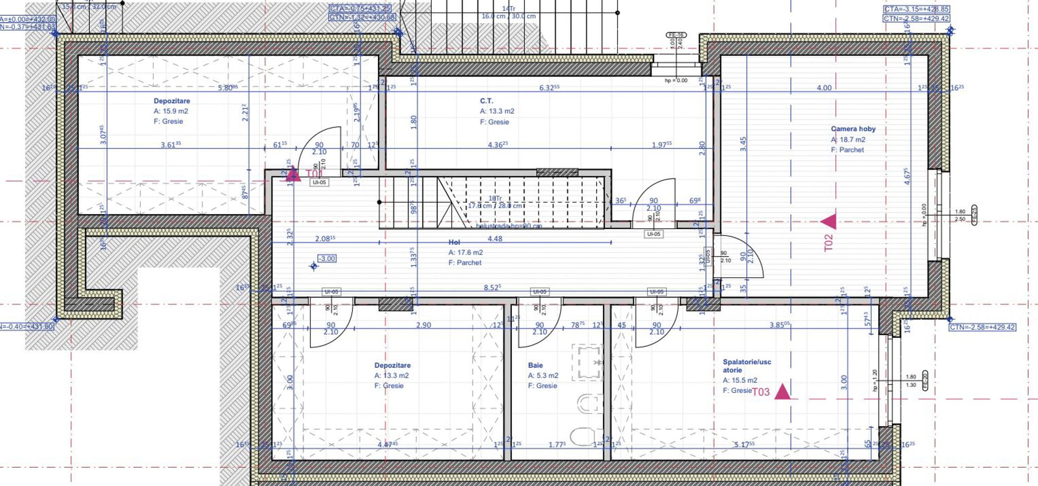 - Demisol: baie, spalatorie, 2 camere depozitare, camera hobby