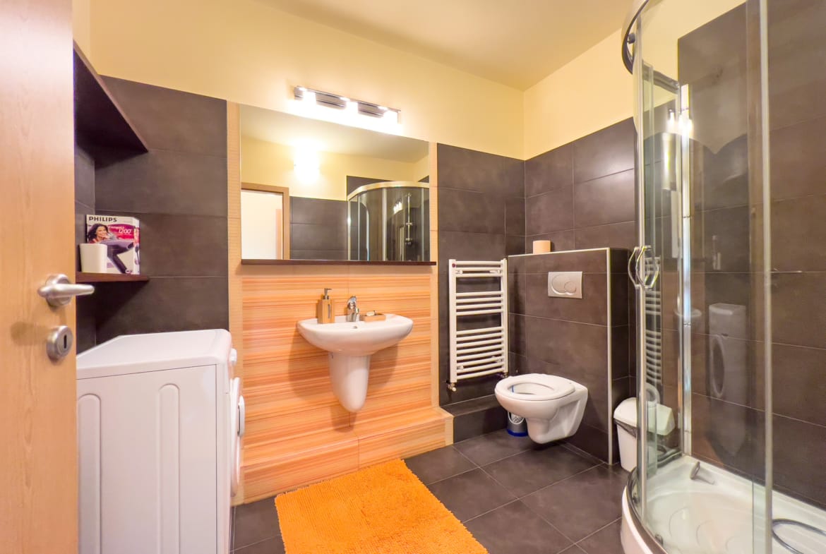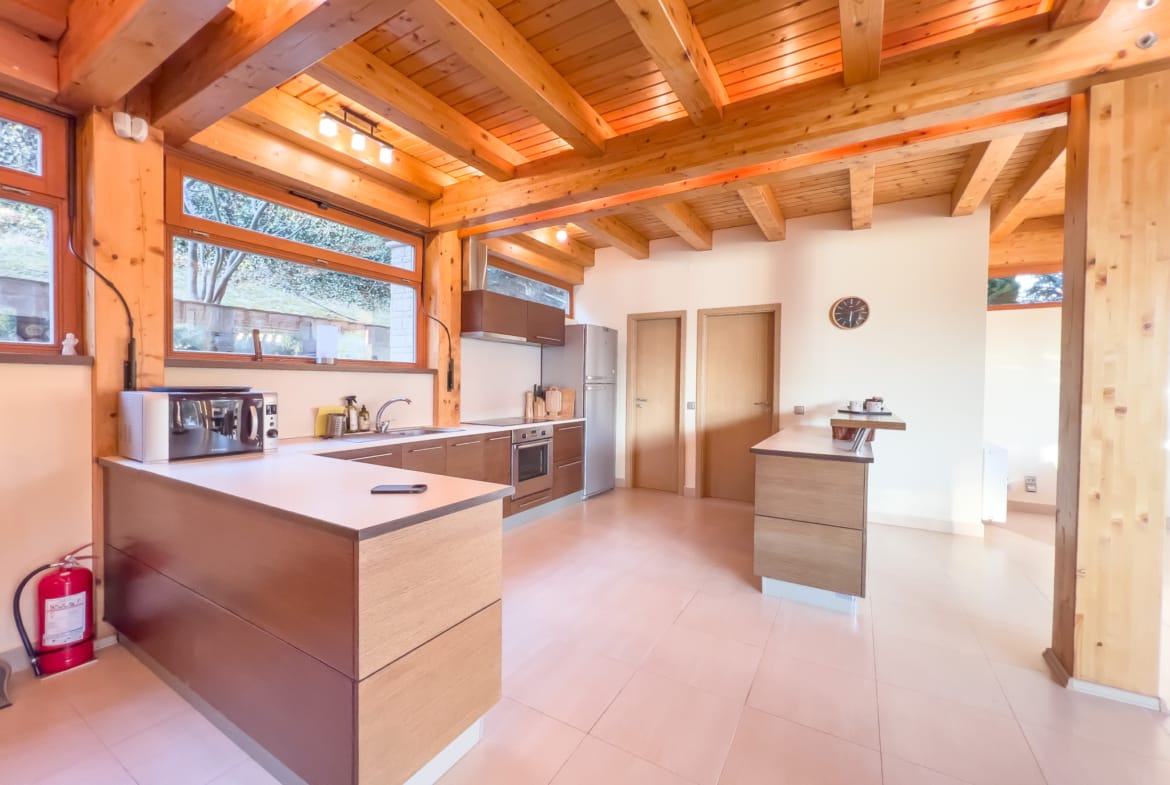 Parter 90mp:Bucatarie completa utilata, dotata cu electrocasnice necesare: frigider cu congelator; cuptor si plita electrica, cuptor cu microunde, masina de spalat vase, masina de spalat haine;Locul de luat masa cu vedere inspre lac;Zona de loby, cu canapele, fotolii si semineu Caminettimontegrappa 19KW cu ventilator cu care poti incalzi toata cabana;Baie de serviciu;Camara de alimente;Din zona de living se iese pe terasa exterioara placata cu dek din lemn, in suprafata de 80 mp.