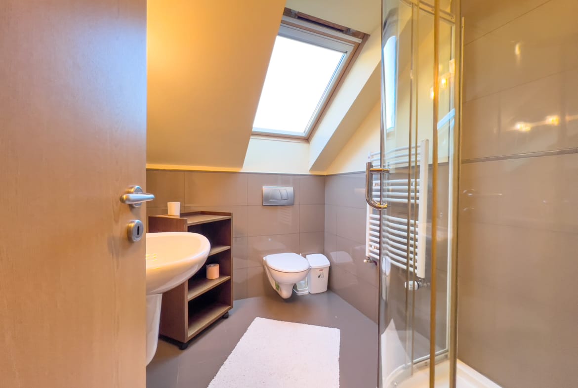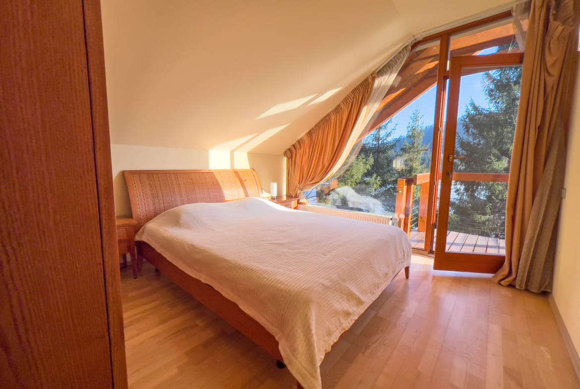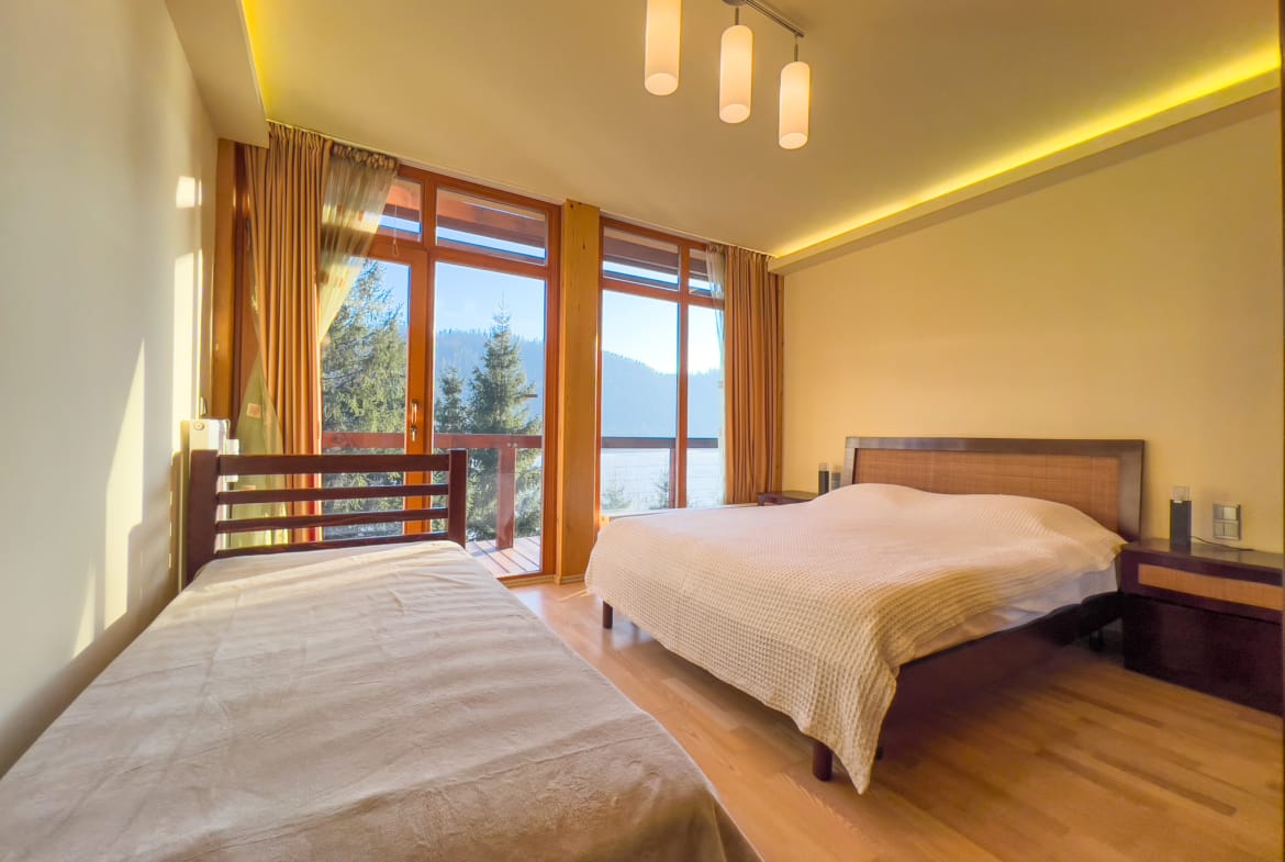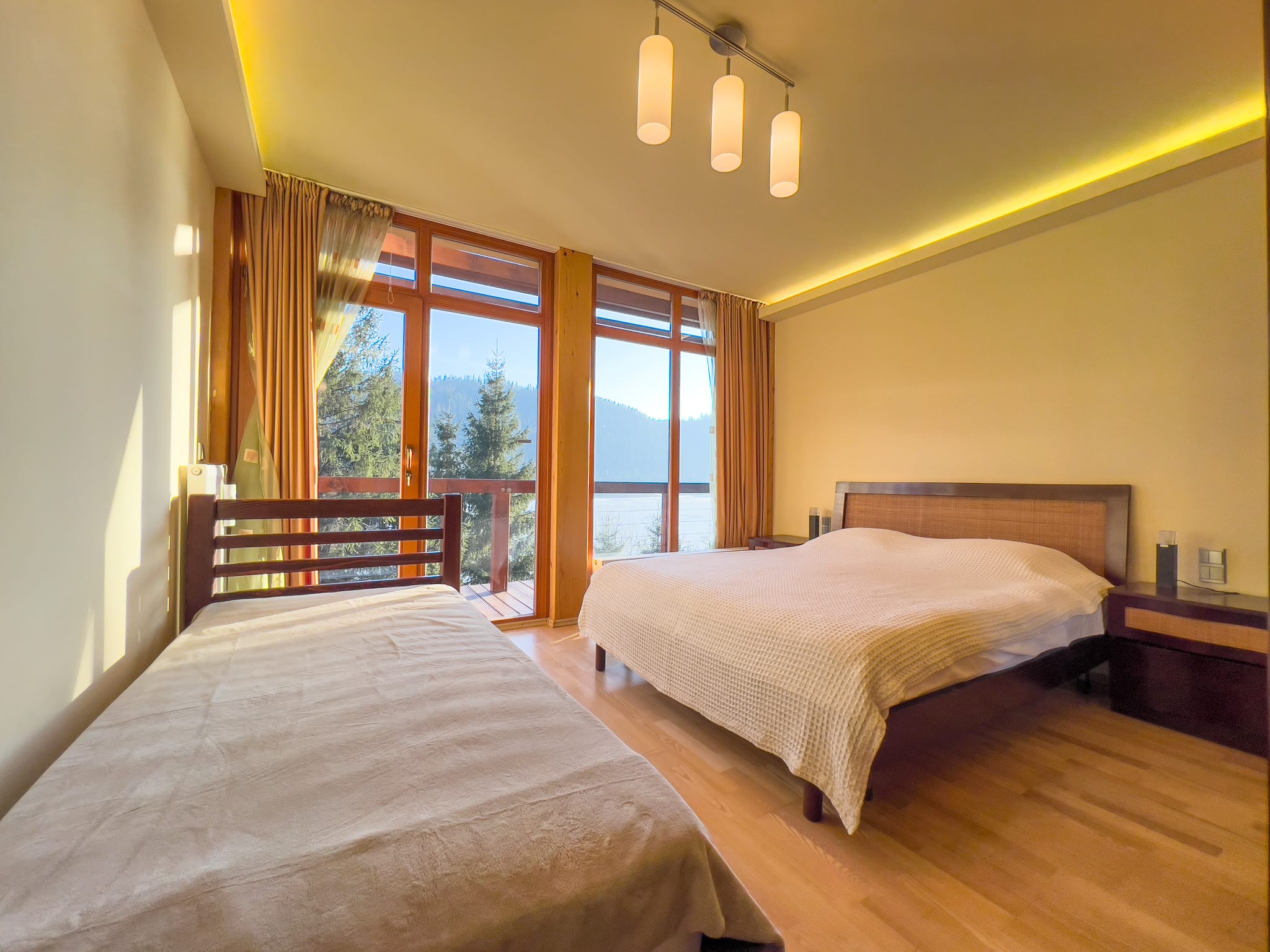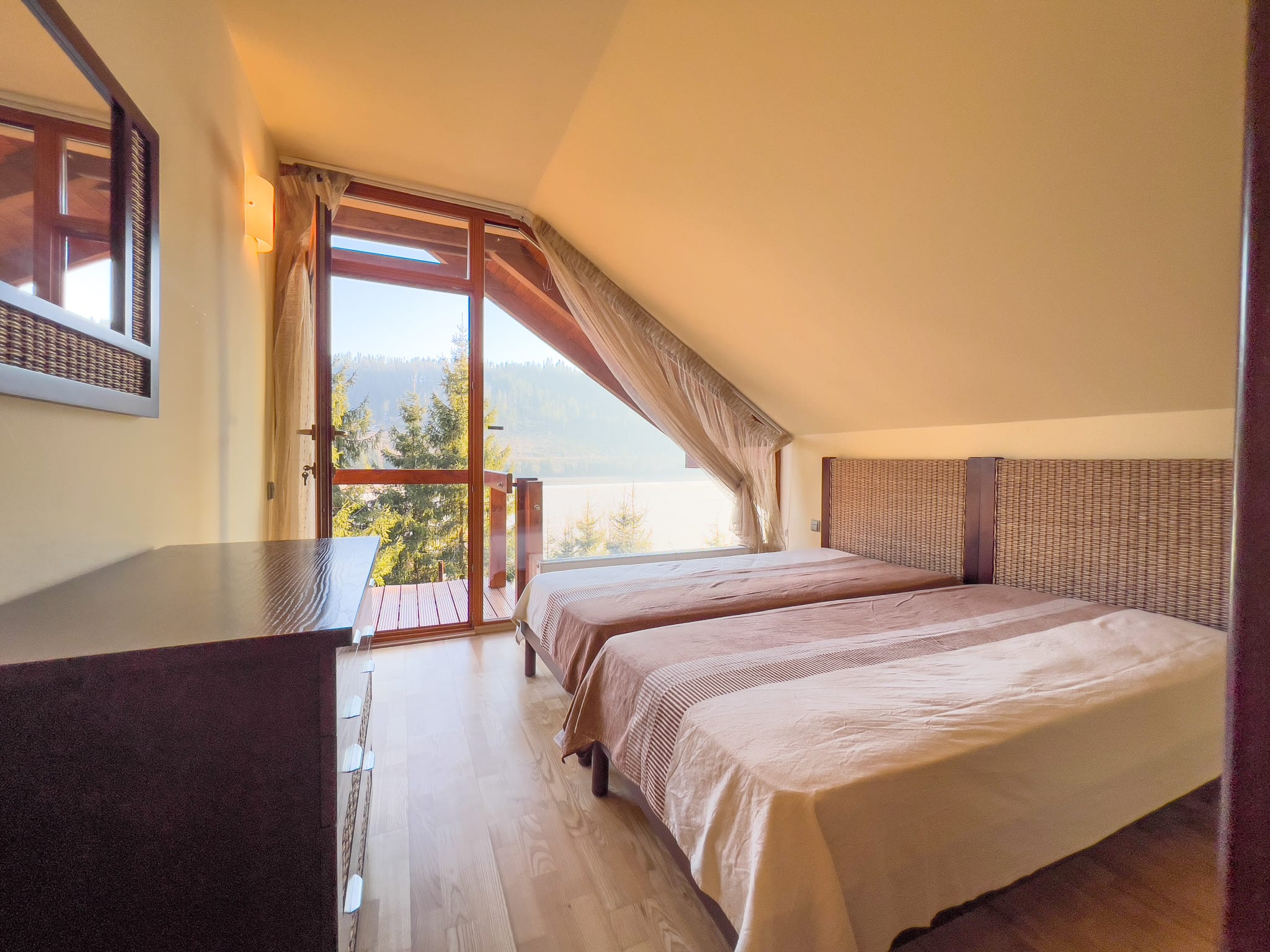 Mansarda 90mp: 1 dormitor cu pat matrimonial + un pat single, dulap, noptiere;1 dormitor cu paturi separate, dulap si noptiere;1 apartament cu 2 camere si baie, dotate cu mobilierul necesar unui apartament;Din fiecare camera se poate iesi pe un balcon generos de pe care se poate admira natura si lacul;Cabana dispune de un pod – de 90 mp, utili pentru depozitare. Este izolat termic cu vata minerala bazaltica de 18 cm si placat total in OSB;