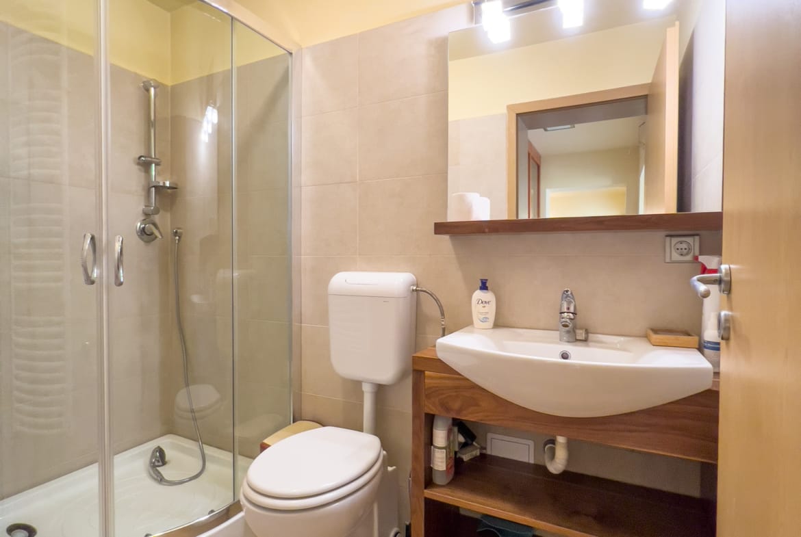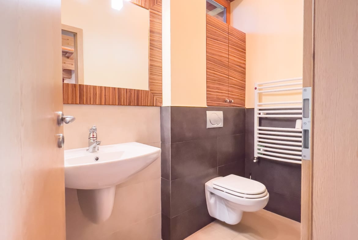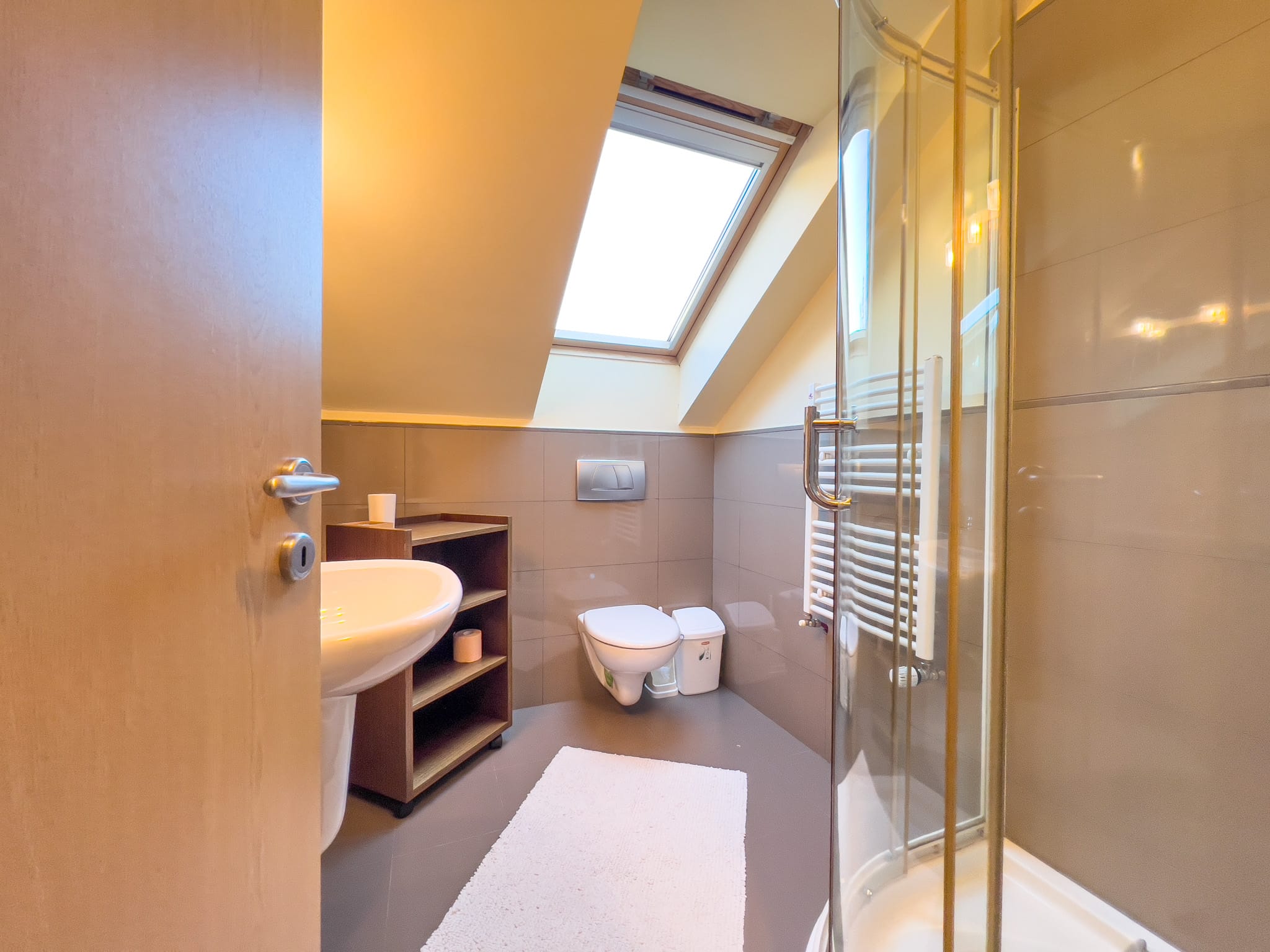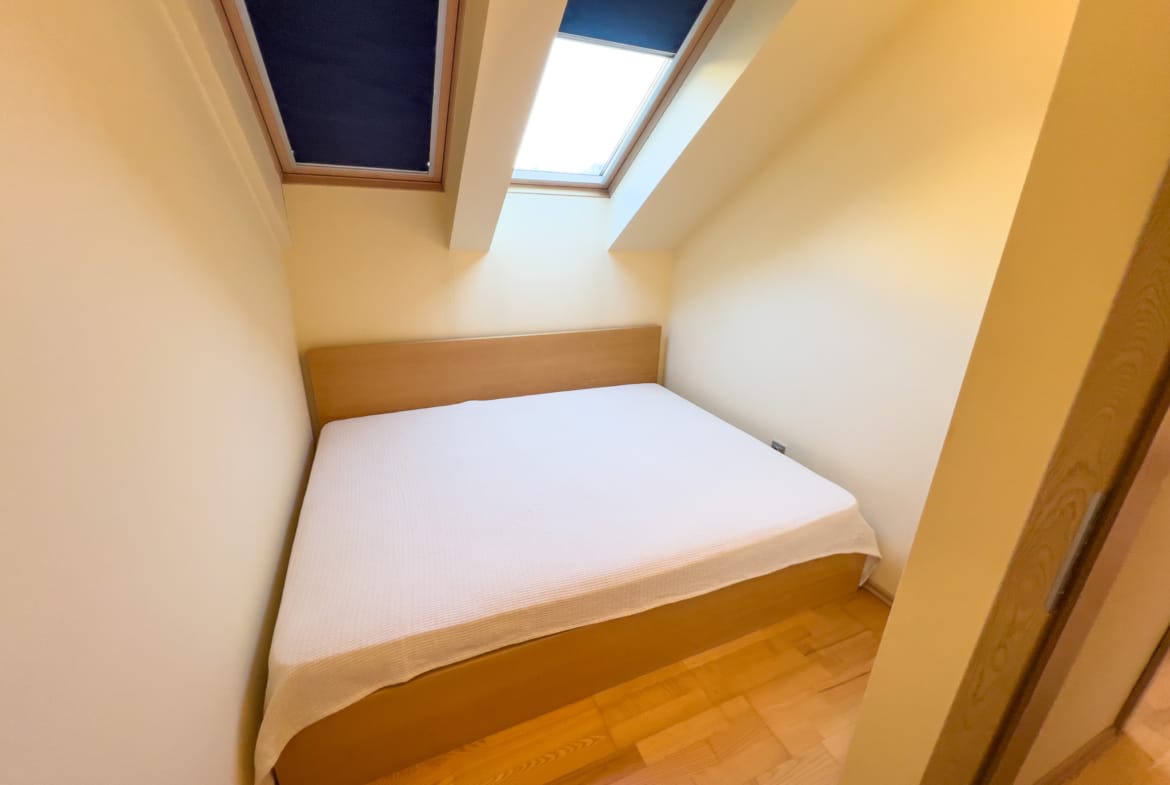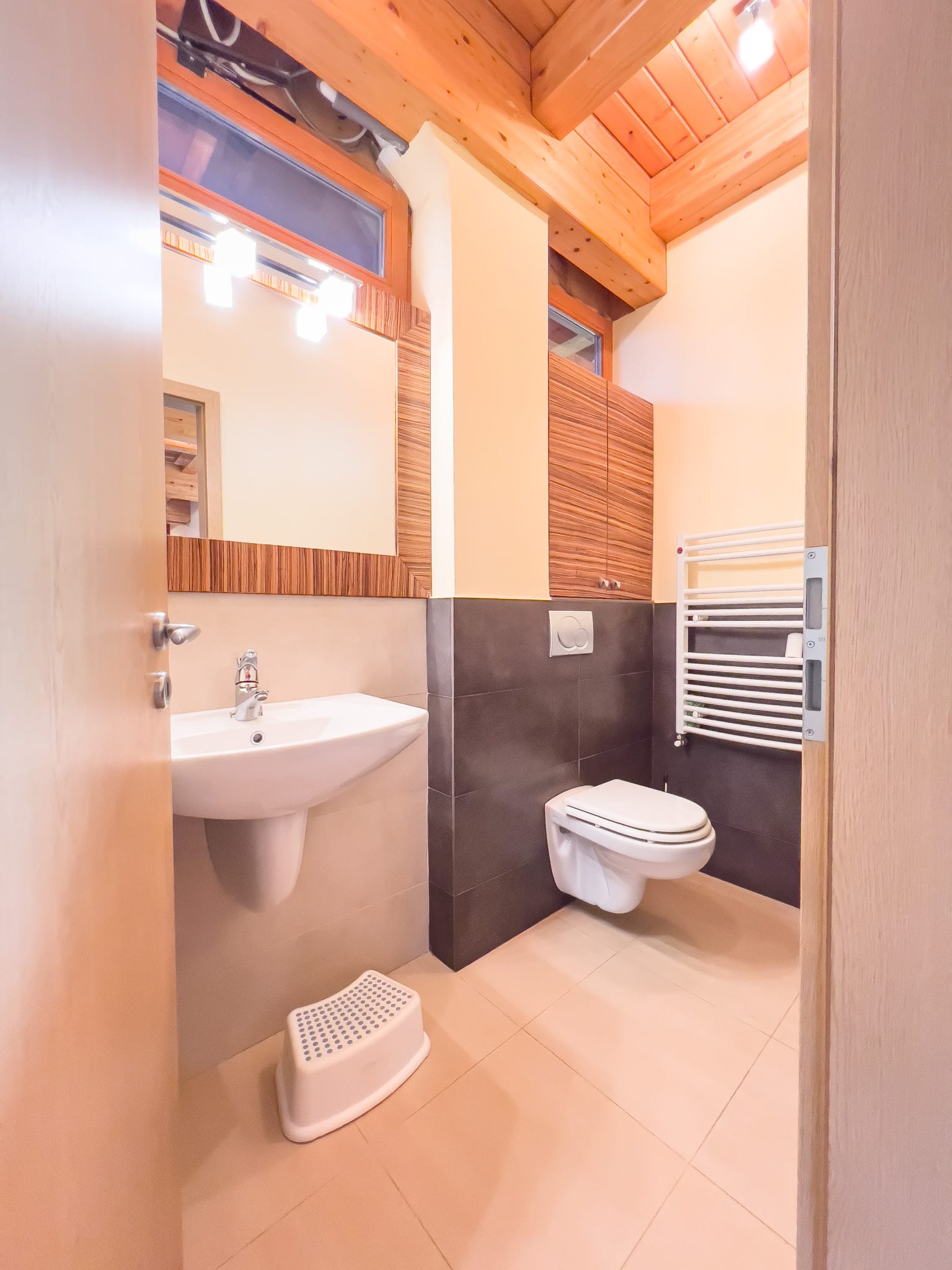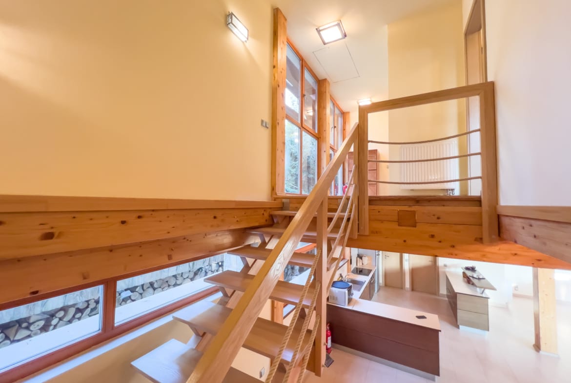 Mansarda 90mp: 1 dormitor cu pat matrimonial + un pat single, dulap, noptiere;1 dormitor cu paturi separate, dulap si noptiere;1 apartament cu 2 camere si baie, dotate cu mobilierul necesar unui apartament;Din fiecare camera se poate iesi pe un balcon generos de pe care se poate admira natura si lacul;Cabana dispune de un pod – de 90 mp, utili pentru depozitare. Este izolat termic cu vata minerala bazaltica de 18 cm si placat total in OSB;