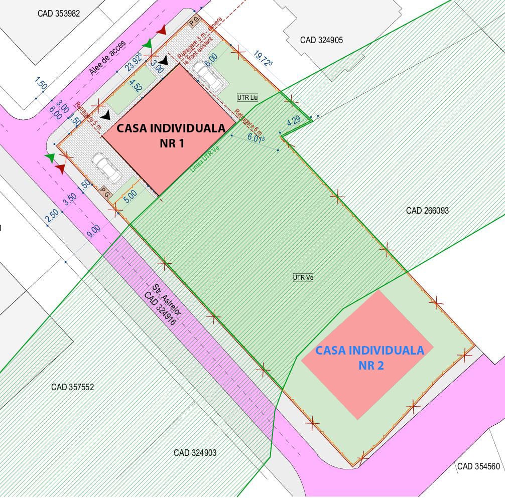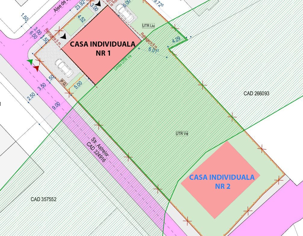 Terenul a făcut parte dintr-un PUZ care între timp a expirat. În prezent, se află în procedura de certificare prin derogare, ceea ce înseamnă că pentru prima casă se va putea obține rapid autorizația de construire, fără alte proceduri urbanistice suplimentare. Pentru cea de-a doua casă va fi necesară ulterior o nouă certificare, cel mai probabil printr-o procedură de urbanizare de tip PUD sau PUZ. Estimăm că pentru această a doua casă procesul de autorizare ar putea dura aproximativ 1–2 ani, în funcție de cerințele primăriei.